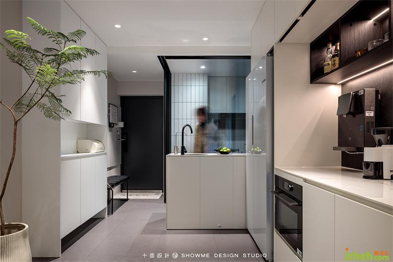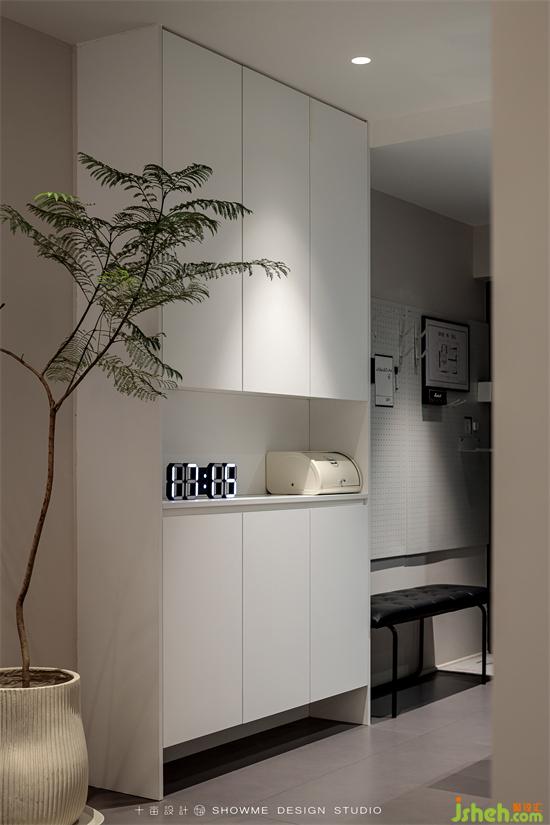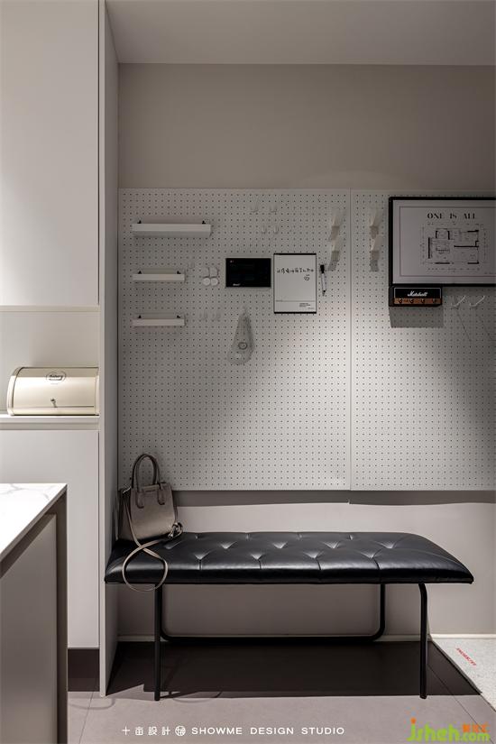 進(jìn)門的縱深感很強(qiáng),首先看到的是客廳的大窗戶,窗外的框景與室內(nèi)構(gòu)成完整和諧的視覺效果。右手邊是實(shí)用性很強(qiáng)的鞋柜、凳子、小件掛架,滿足回家放置物品的第一需求。