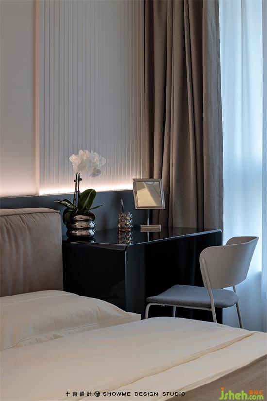 主臥延續(xù)了全屋色調(diào)風(fēng)格,家裝設(shè)計(jì)半墻藝術(shù)漆飾面具有高顏值耐臟耐磨的特性,暖光燈帶、柔和的吊頂無一不營造出舒適安靜的睡眠氛圍。