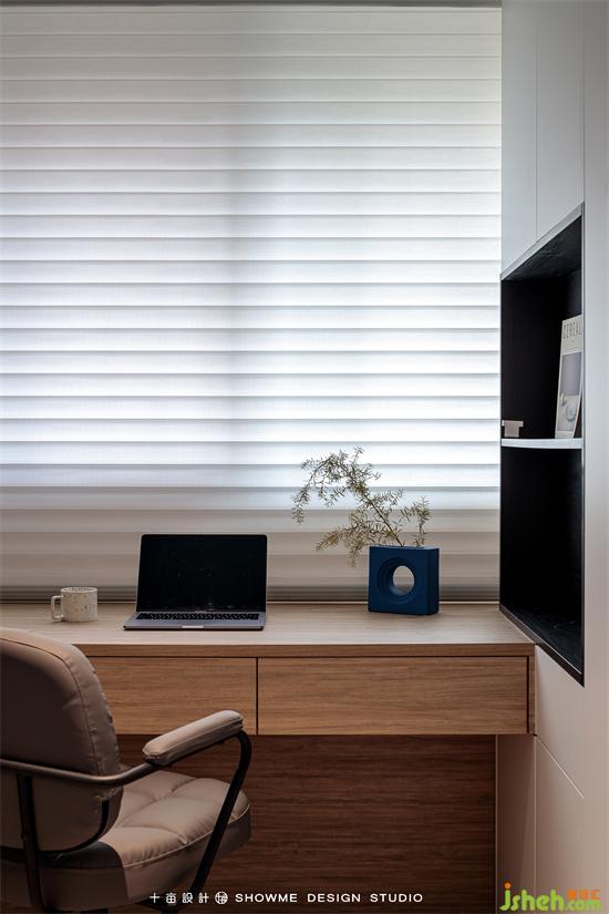 在有限的空間里,打造書桌、書柜、儲物柜一體式設(shè)計(jì),色調(diào)則采用黑色、白色與木色相間的搭配方式,家裝設(shè)計(jì)讓這里成為集收納、休閑、娛樂、辦公于一體的家居空間。