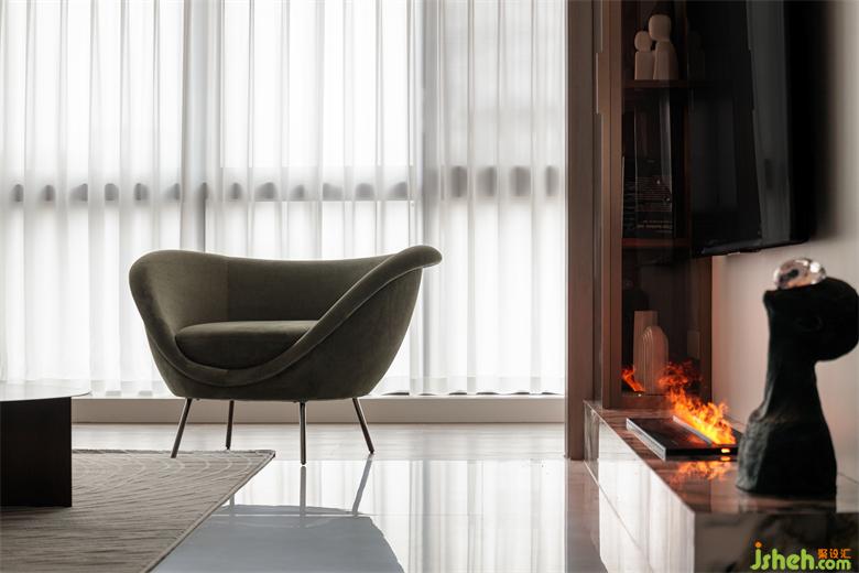 地臺(tái)取代了電視柜,儲(chǔ)物柜的玻璃也用的是獨(dú)特的咖啡色,品味與格調(diào)雙雙拉滿。
