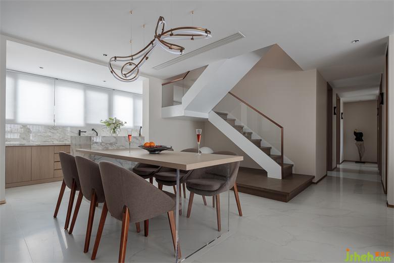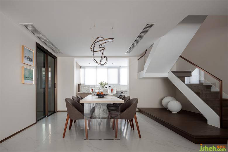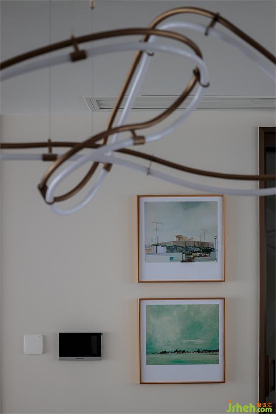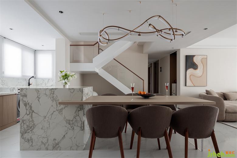 與客廳空間相互呼應(yīng),形成了良好的互動(dòng)性。而曲線彎曲造型的吊燈讓橫平豎直的空間增添了一絲妖嬈,也體現(xiàn)出不俗的審美。