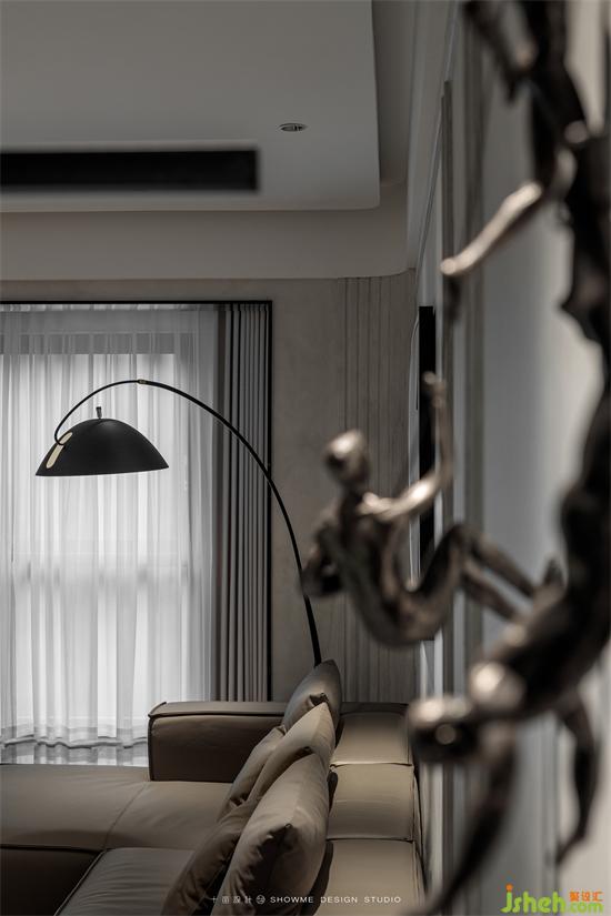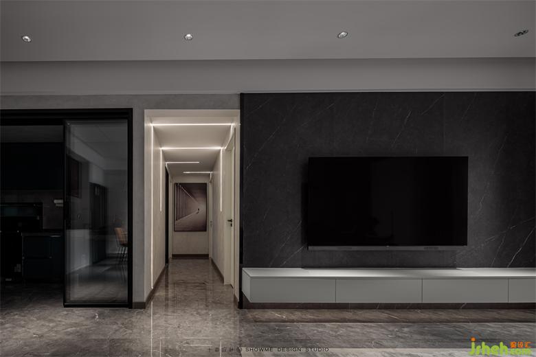 廊道區(qū)主色調(diào)是白色,與客餐廳區(qū)域形成鮮明的對(duì)比,寓意時(shí)空的變換交替,是從生活區(qū)到休息區(qū)的過渡,盡頭的掛畫與走廊呼應(yīng),營(yíng)造出一種意猶未盡之感。