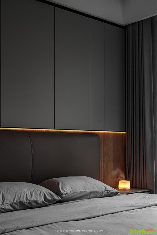 臥室也保持了一以貫之的黑白灰風(fēng)格。木色背景板和簡潔流暢的線條設(shè)計(jì)是臥室的主基調(diào),內(nèi)江邦泰天著家裝設(shè)計(jì)沒有繁復(fù)的臥室吊燈,利用充滿設(shè)計(jì)感的燈帶帶來的柔光來營造溫馨舒適的氛圍。