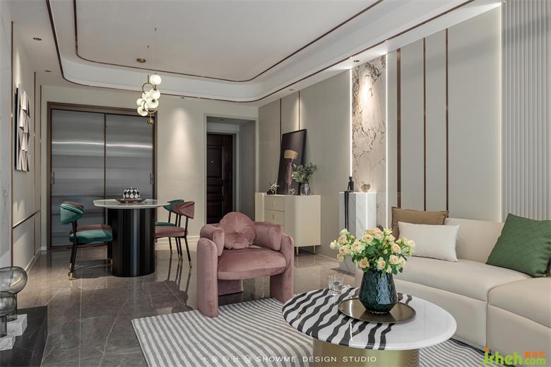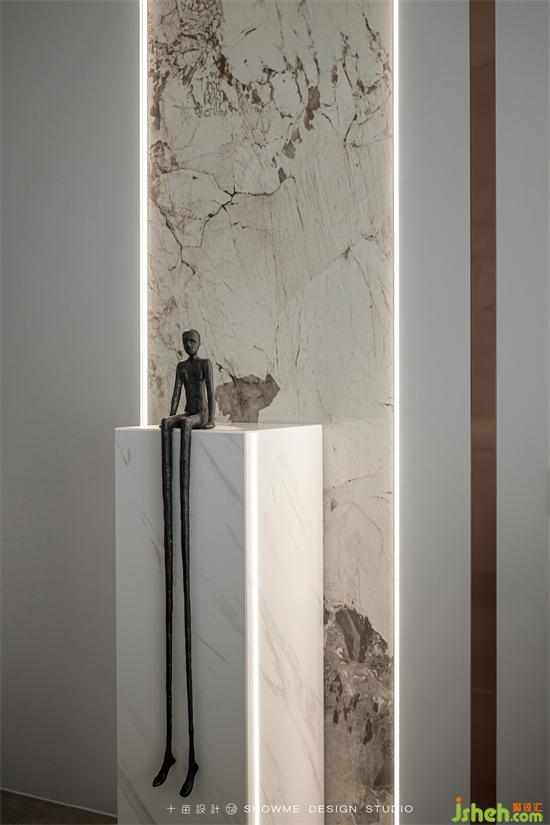 電視背景墻才用了當(dāng)下最流行的白色巖板材質(zhì),與黑色的地臺(tái)形成色彩上的鮮明反差。