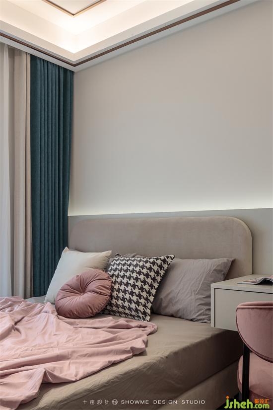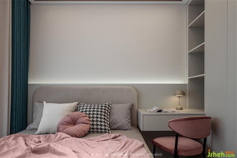 區(qū)別于主臥的整體墻面軟包,次臥選擇半墻軟包以達到視覺分層的效果。定制柜上墻的優(yōu)點明顯,既節(jié)省了空間,又可以做到一柜多用。