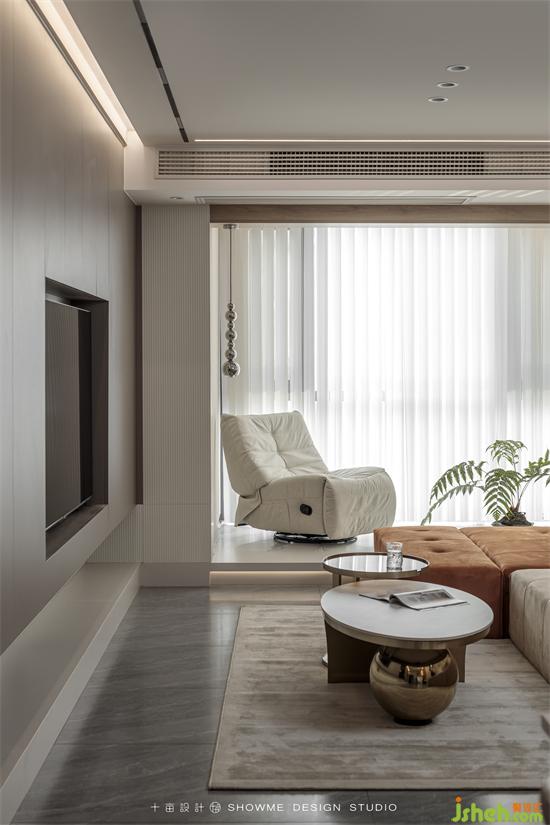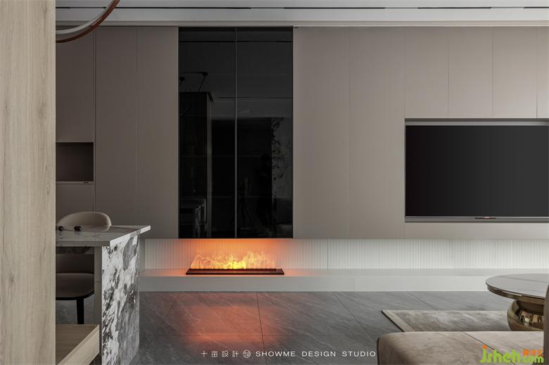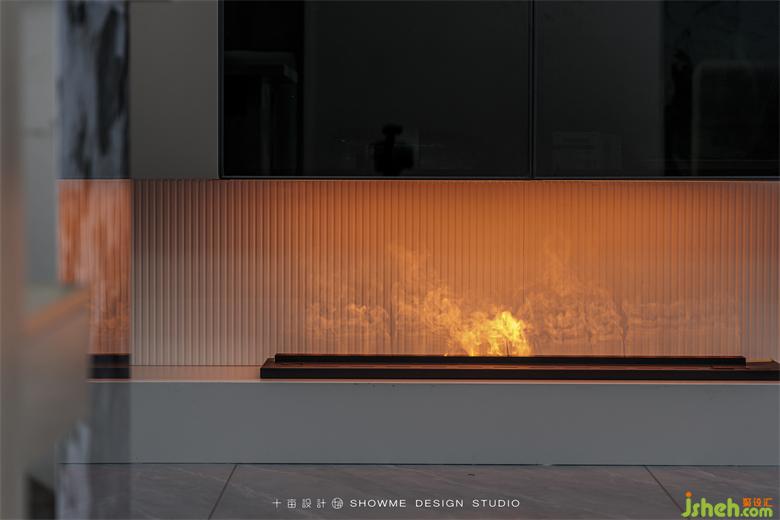 嵌入式電視墻保持了空間的整體性,跳躍的爐火為一字型地臺增添一抹亮色,豐富了整個空間層次。