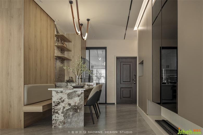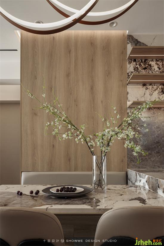 木色與花色巖板交替搭配,錯落有致,曲線造型的吊燈與巖板的硬朗形成剛?cè)釋Ρ?,視覺效果非常贊。