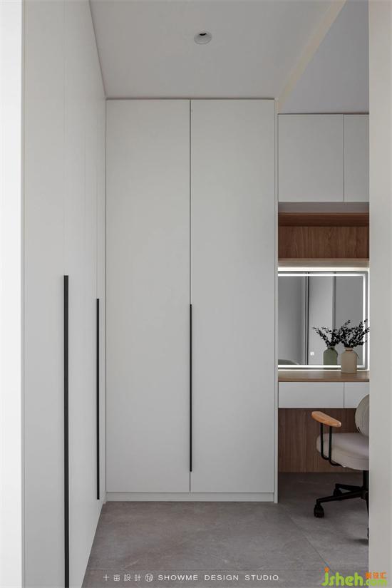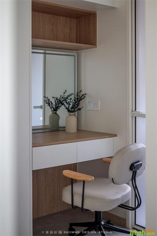 衣帽間除了有超大容量的儲物衣柜外,還增設(shè)了一個定制化妝桌柜,國賓上院家裝設(shè)計空間功能更加多樣化。