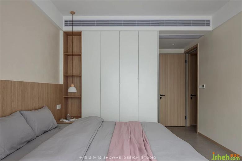 定制衣柜靠床頭的位置貼心地設(shè)計為鏤空格欄狀,方便收納取拿各種生活物件。