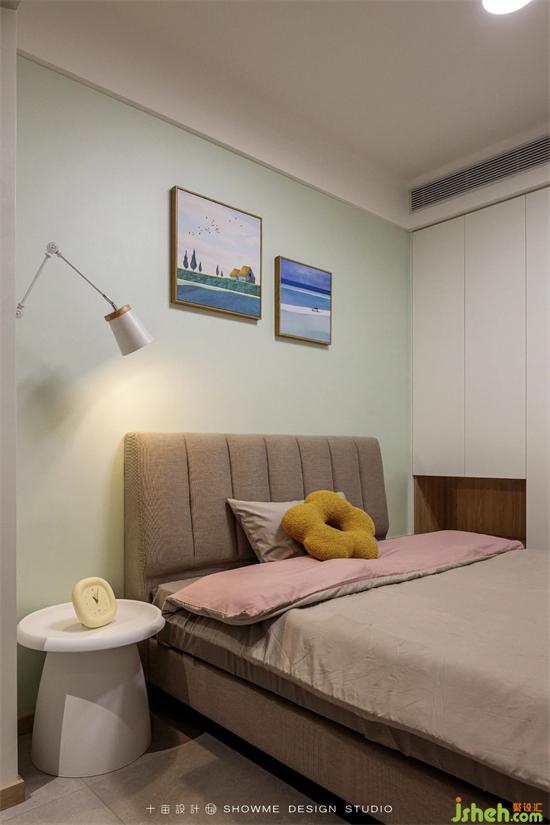 次臥采用綠色藝術(shù)漆作為床頭裝飾,色彩搭配更加清新,國賓上院家裝設(shè)計加上圓形床頭燈和白色圓形蘑菇床頭柜,增添了可愛活潑的色彩。