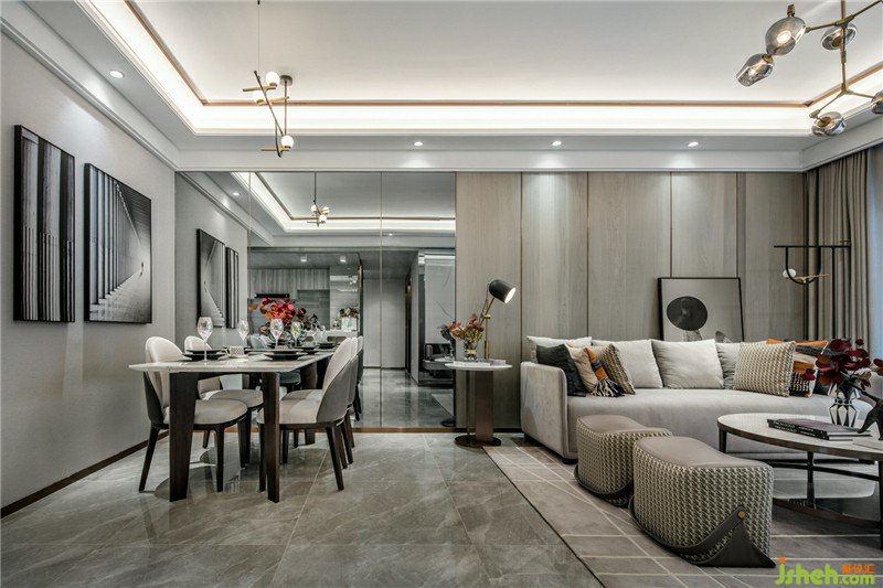 色調(diào)上,呈現(xiàn)現(xiàn)代都市感;材質(zhì)上,局部墻面搭配淺色木飾面及銀鏡以增加空間的層次感;