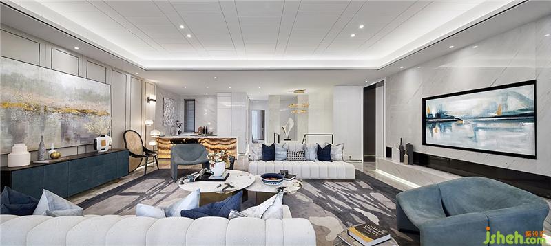 儒雅書卷氣,一身翰墨香。書房是一個家的文化載體。書房以質(zhì)感、沉穩(wěn)的新海派風格家具,在整體色彩上以白色調(diào)為主,加一些小面積的金屬與藍色點綴,打造低調(diào)輕奢氛圍