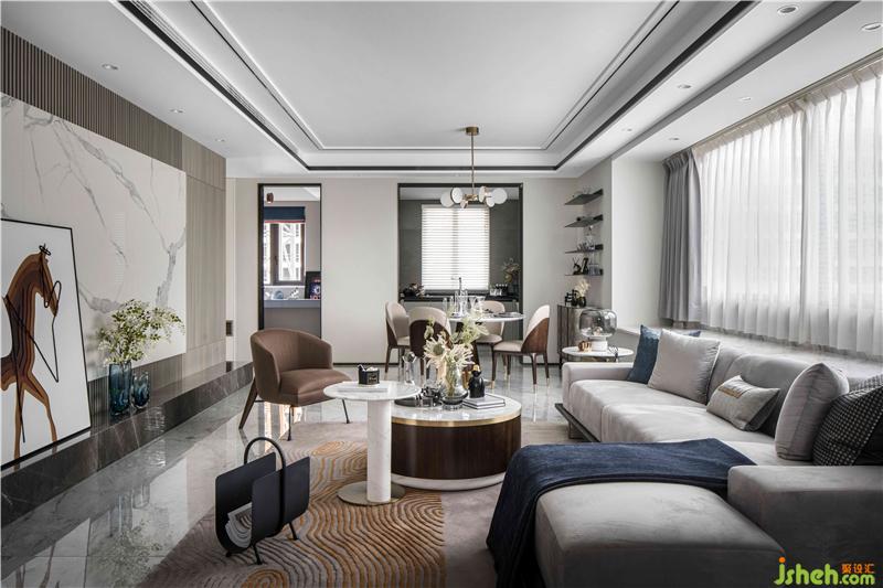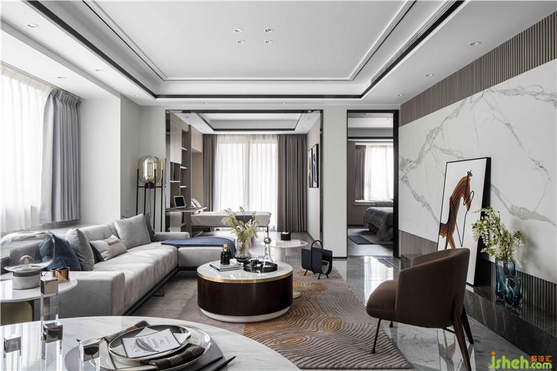 客廳大理石背景墻的天然肌理與淡雅溫和的木飾面相結(jié)合,二者質(zhì)感對(duì)立卻相互融合,營(yíng)造出空間的默契感。樣板房設(shè)計(jì)