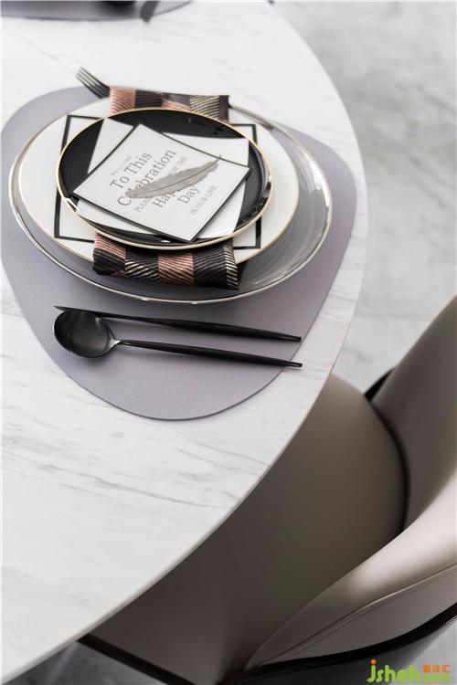開放式廚房餐廳延續(xù)了客廳的主色調(diào),二者既互通相連,又各自具有空間的獨(dú)立性。營(yíng)造輕松但不失品質(zhì)的就餐氛圍。深色木飾面搭配灰白色皮質(zhì)的座椅與玻璃質(zhì)感的吊燈和餐桌飾品搭配,來(lái)自廚房與客廳的光線同時(shí)傾入,帶來(lái)更多溫暖體驗(yàn)。樣板房設(shè)計(jì)