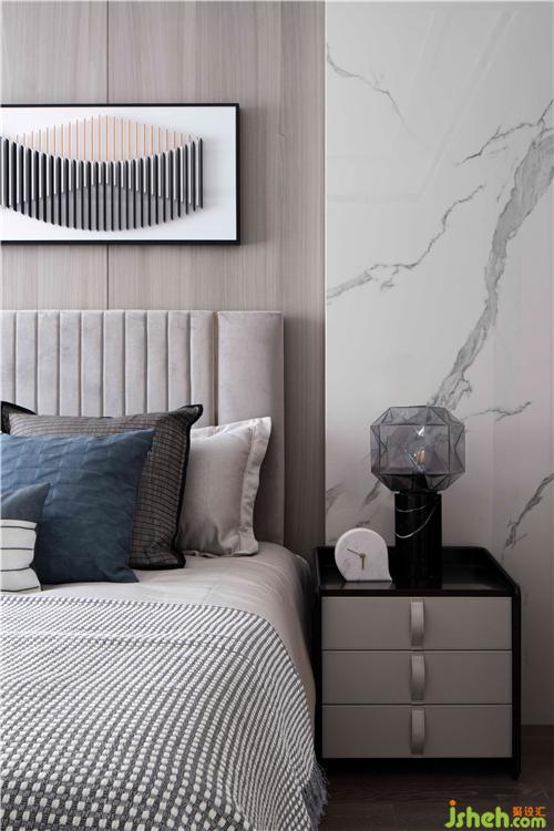 主臥的設(shè)計(jì)大氣利落,大面積的木飾面搭配局部大理石的點(diǎn)綴,優(yōu)雅堅(jiān)韌的特質(zhì)被抽象地轉(zhuǎn)化為幾何線條,柔軟細(xì)膩的灰調(diào)搭配令人身心放松,空間沉靜而美好。滲透于細(xì)節(jié)之中的品質(zhì),交融出經(jīng)典與現(xiàn)代的重構(gòu)之美。樣板房設(shè)計(jì)