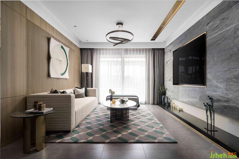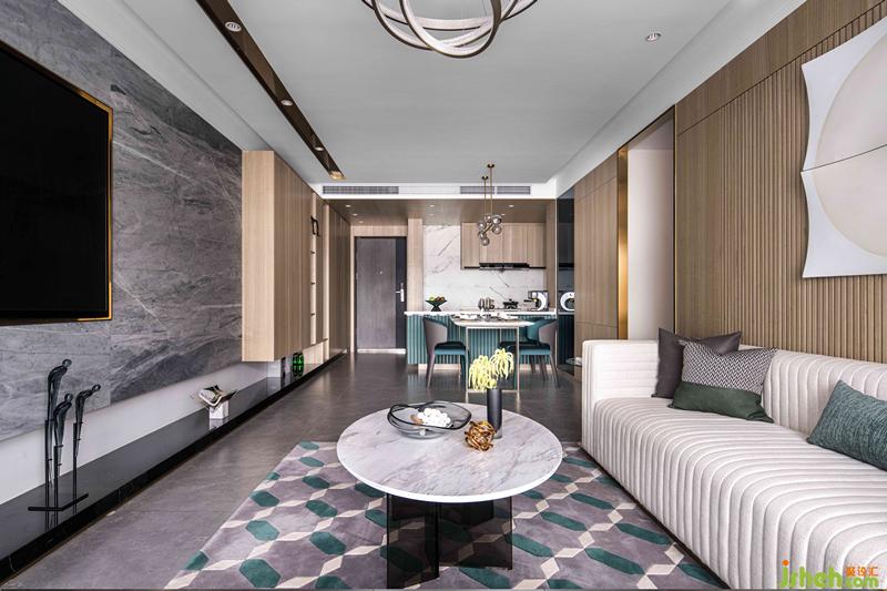 客餐廳主要以原木色為基調(diào),寶石綠點(diǎn)綴空間,呈現(xiàn)出自然舒適的生活感??筒蛷d與廚房為開放空間,賦予空間藝術(shù)、雅致而自由的生活氛圍。入戶設(shè)置鞋柜,沿著動(dòng)線延伸引出電視背景墻。大理石、金屬和木飾面的交錯(cuò)組合,豐富客廳的層次感。從入口到共享空間,有節(jié)奏的呈現(xiàn)了簡單明快、合理的結(jié)構(gòu)。樣板房設(shè)計(jì)