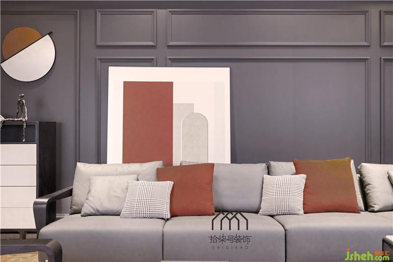 深灰色的石膏線框背景搭配現(xiàn)代簡約的落地裝飾畫,深色的空間中加入白色塊的軟裝,柳州家居裝修將空間中的深沉提亮,制造簡約清新的家。