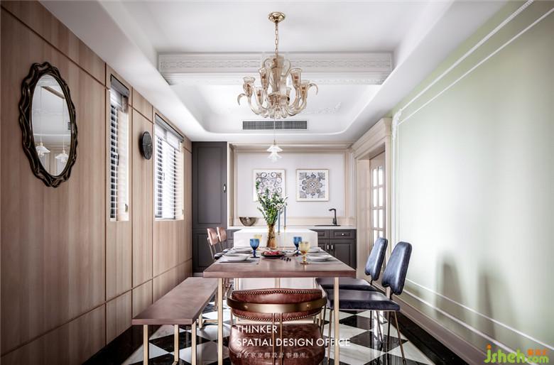 · 中廚,西廚和餐廳有機地連接在一起,優(yōu)化生活動線。雅士白島臺,原木餐桌,淺色木飾面,清新綠色墻面,一半現(xiàn)代,一半法式,起承轉(zhuǎn)合著復(fù)古之美與現(xiàn)代輕奢的時尚腔調(diào)。一席長宴,即一件不菲的生活藝術(shù)品,凝聚著溫暖與情感。