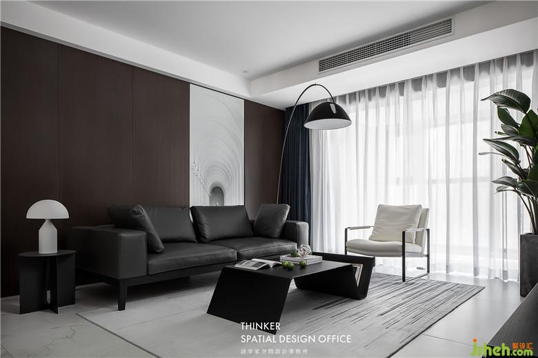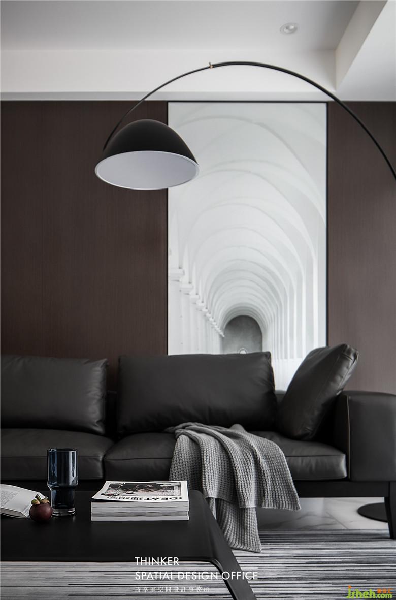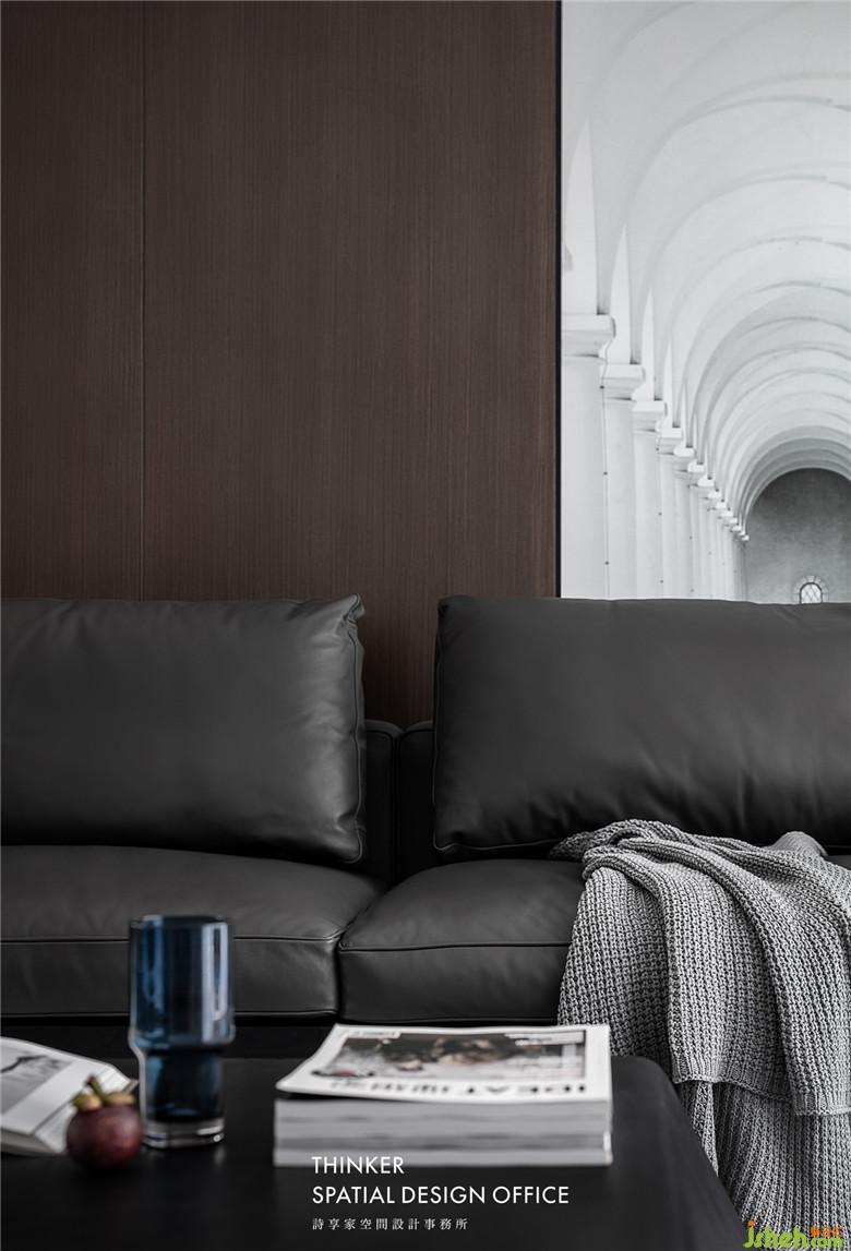 家具款式簡約明了,沙發(fā)皮革的質(zhì)感與墻面黑胡桃木紋碰撞,帶來硬朗卻又溫潤的時尚感;定制的建筑透視畫,產(chǎn)生虛實結合的視覺體驗,同時提亮了客廳的整體色調(diào)。
