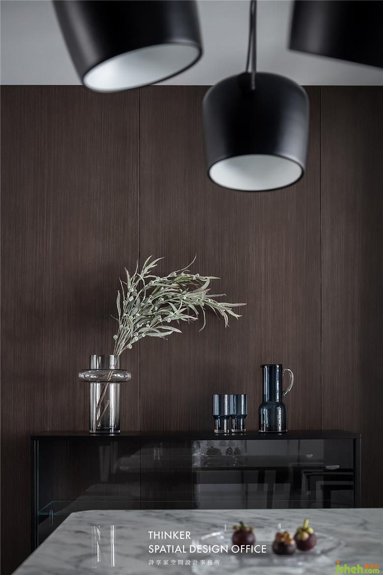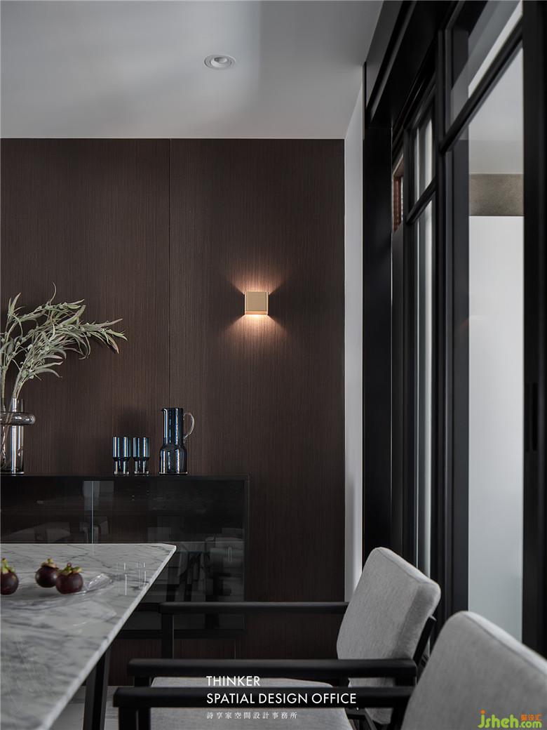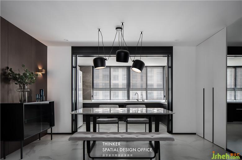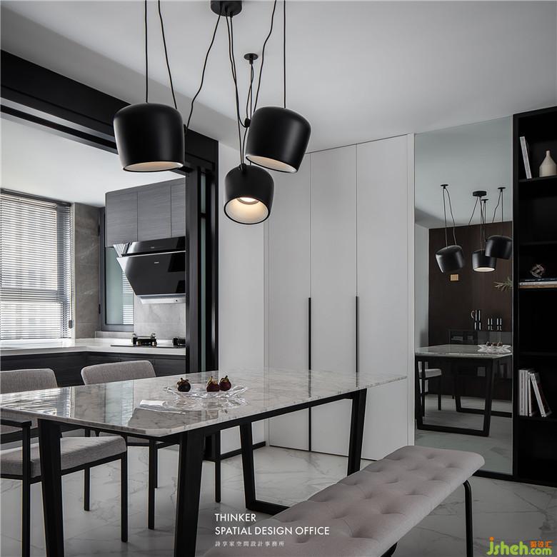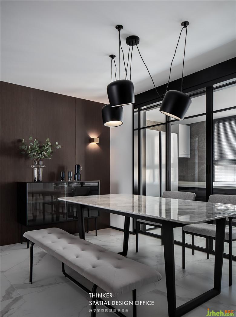 室內(nèi)設計師將廚房整體搬移到陽臺,讓餐廳有了更大的擴展空間。黑胡桃護墻板與客廳相呼應,餐桌和石材與柔軟的布藝餐椅形成對比,黑白灰的空間里,材質(zhì)表達出更豐富的空間情感。