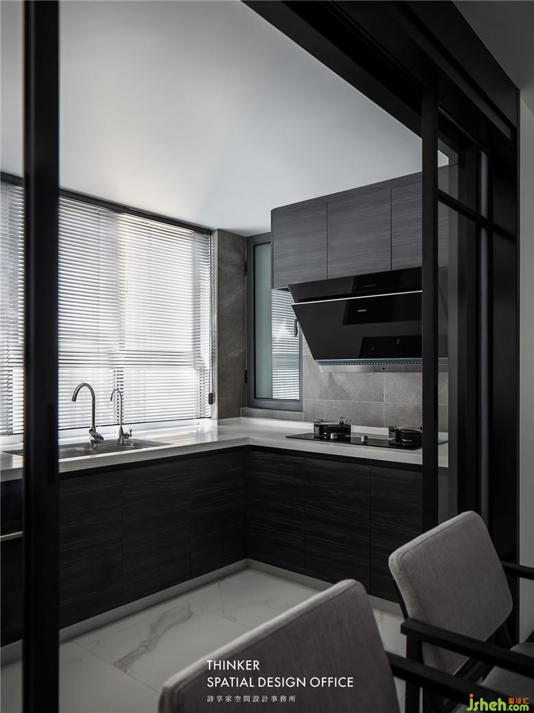 廚房簡潔內(nèi)斂,選擇同色系的櫥柜與客餐廳呼應,而隱形門的設計能夠讓空間開闔自如,根據(jù)需要變換不同的生活場景。