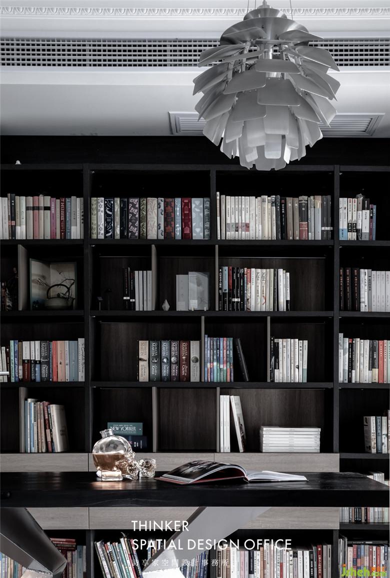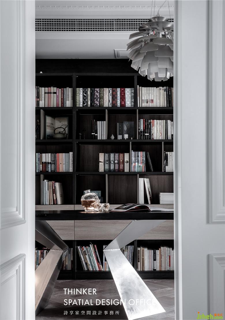 一整面墻的定制書柜是男女主人共同的心頭好,即便如此,書柜也只擺放了他們藏書的一小部分。