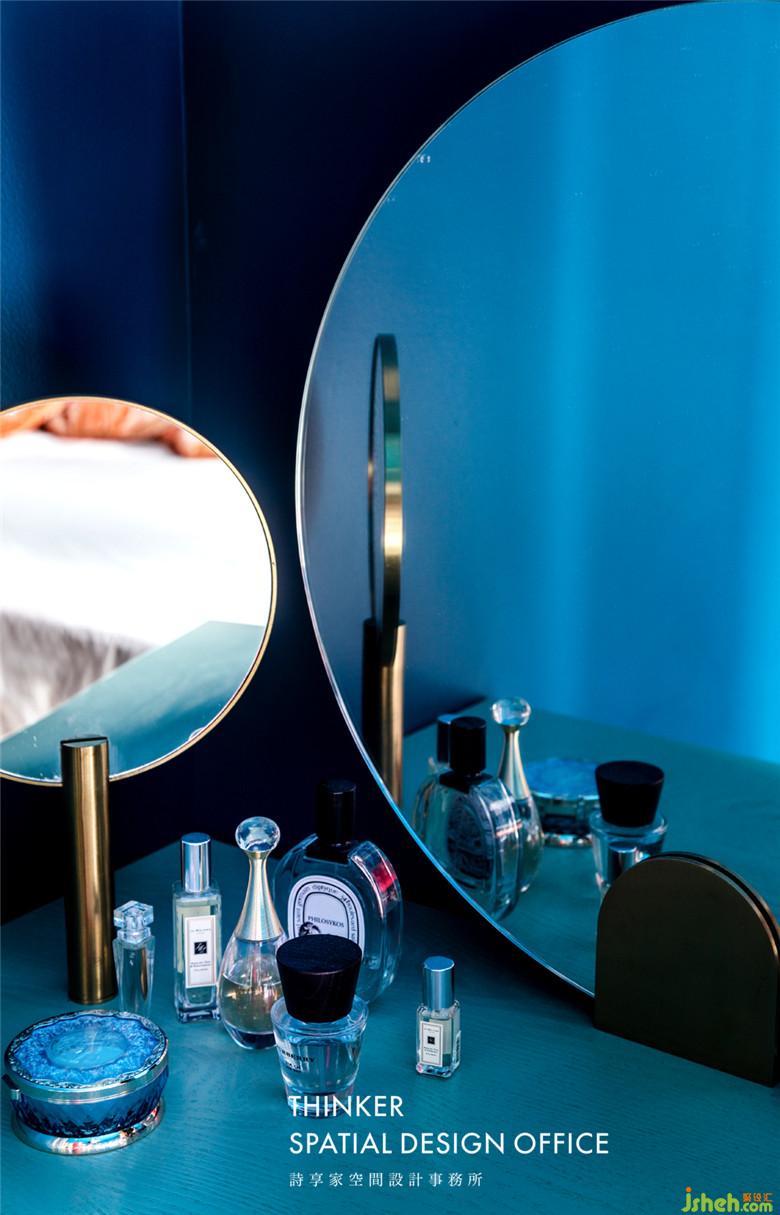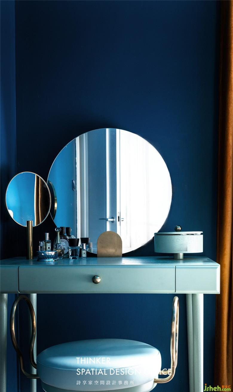 梳妝臺(tái)來自法國Maison Dada,圓潤的線條和極簡設(shè)計(jì),為空間帶來時(shí)尚氣息,與藍(lán)色墻面搭配,更有一種摩登的夢幻感。