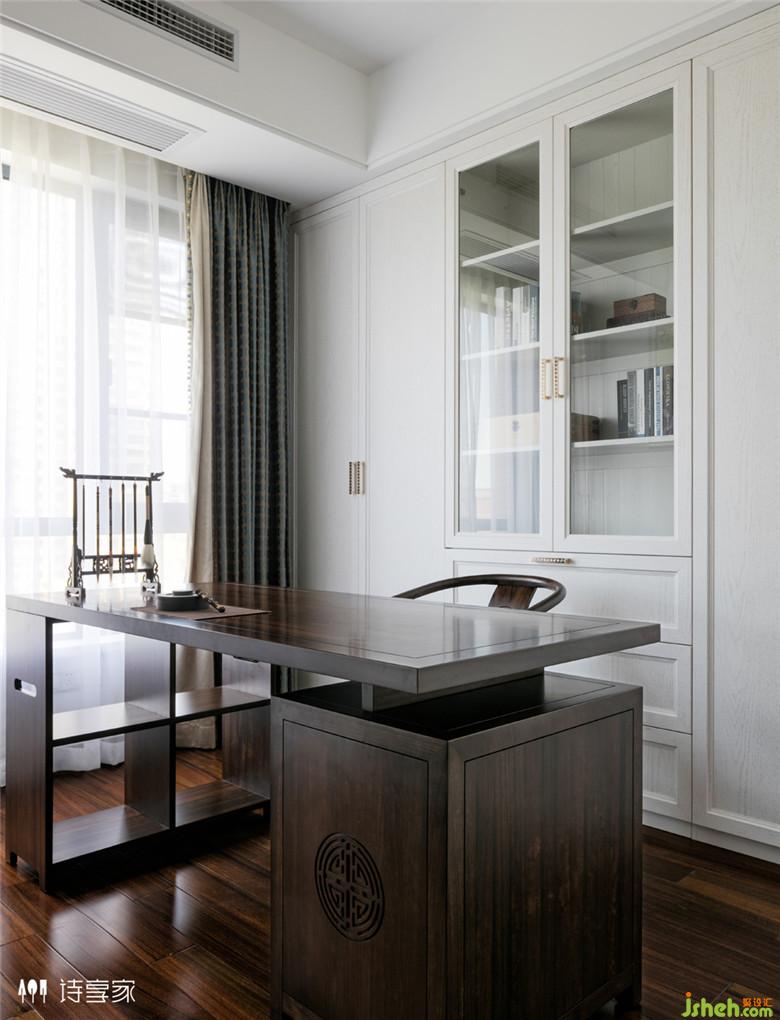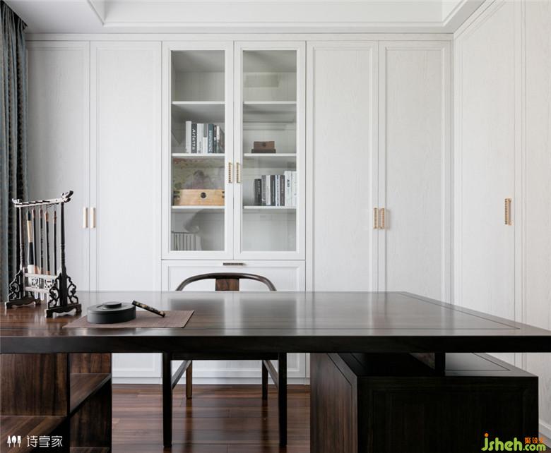 整個設計以白色和深胡桃色為主,搭配了白色的石材,讓整個空間更加豐富和層次感。地面采用水泥色的地磚,與深胡桃墻面的結合有一種古色古香的韻味。用現(xiàn)代感的金屬線條與質(zhì)樸的中式相碰撞,擦出不一樣的火花。