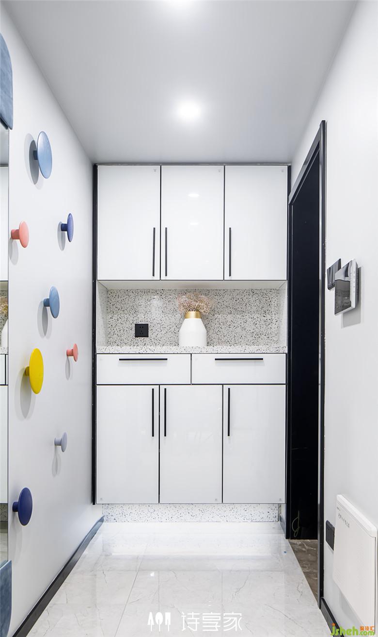 門廳空間不大,但鞋柜、掛衣架及穿衣鏡功能齊全,使用方便。以白、灰為主基調(diào),充滿童趣的彩色掛衣架為空間增添了活潑的色彩。