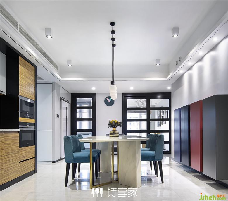 室內(nèi)設(shè)計(jì)師將廚房的長度縮小,增加寬度,讓臺面操作比較方便、集中。同時(shí)擴(kuò)大了餐廳空間,讓整體動線更加流暢。然后在公共區(qū)域增加西廚臺面,彌補(bǔ)廚房臺面的不足,同時(shí)充當(dāng)茶水柜,餐邊柜的功能。