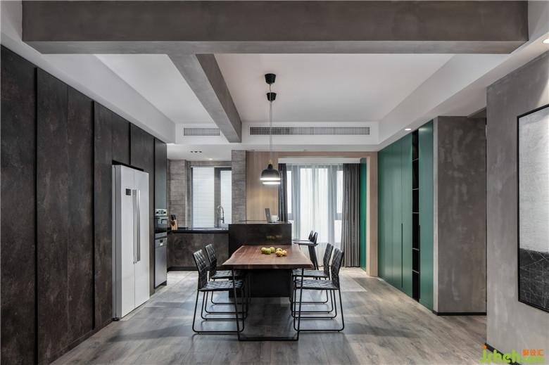 廚房中島與陽(yáng)臺(tái)墻體,餐桌連為一體,形成一個(gè)非常實(shí)用的互動(dòng)空間。延展了操作臺(tái)面,補(bǔ)充了廚房的收納空間,同時(shí)也可以容納多位親朋好友聚餐和游戲。