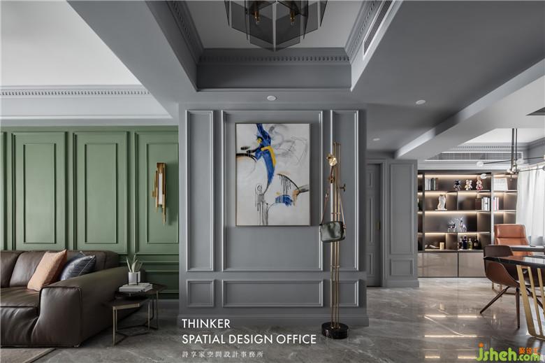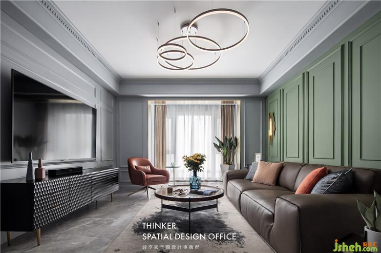 將陽臺擴(kuò)進(jìn)客廳,空間更顯明亮開敞亮,對色彩也有了更多的包容度。室內(nèi)設(shè)計師用淺灰色打底,提升空間氣質(zhì),而綠色沙發(fā)背景則顯得生機(jī)盎然,不需要任何裝飾畫,都能自成一景。