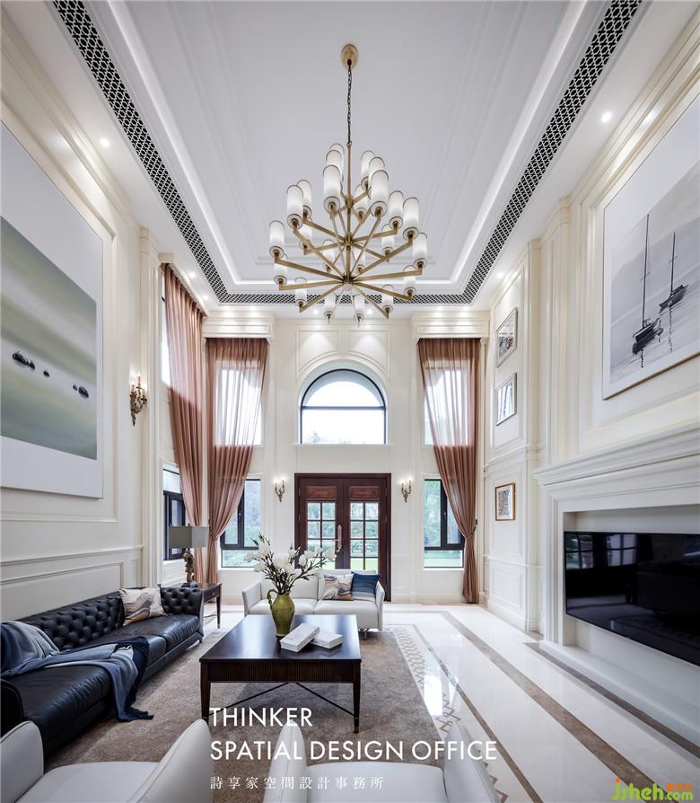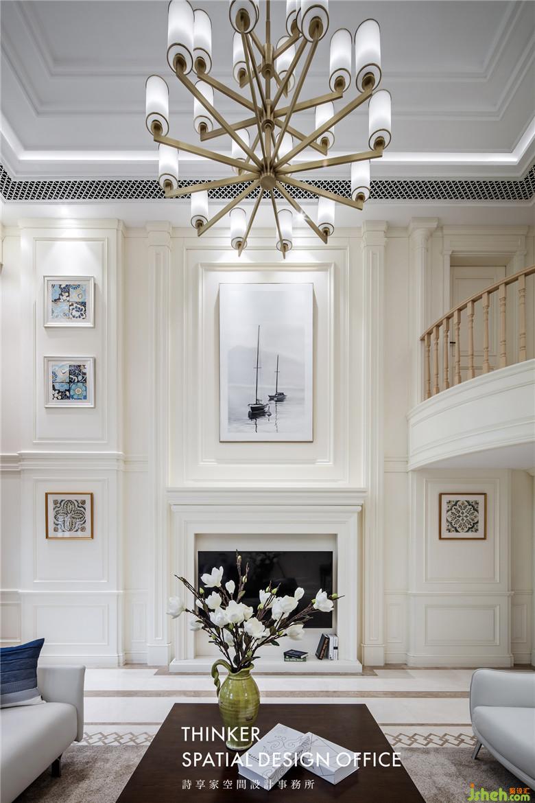純凈的奶白色墻面,細(xì)致的線條變化帶來豐富的層次感,木質(zhì)護(hù)墻板不僅豐富了墻面造型,它溫潤的質(zhì)感也提升了空間氣質(zhì)。經(jīng)典的羅馬柱、壁爐的元素,讓挑空的客廳顯得美式風(fēng)味十足。