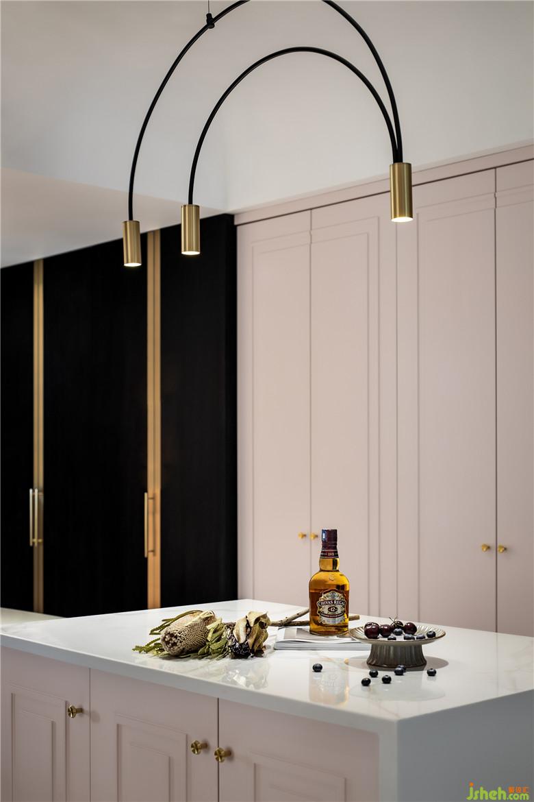 · 餐廳的中島設(shè)計(jì),裝修公司提高了空間互動(dòng)性,也大大增加了操作臺面和儲物空間,方便又實(shí)用!玻璃展柜擺滿Mini喜歡的小物件,燈光采用燈帶與射燈的結(jié)合,讓不同元素構(gòu)成震撼反差。