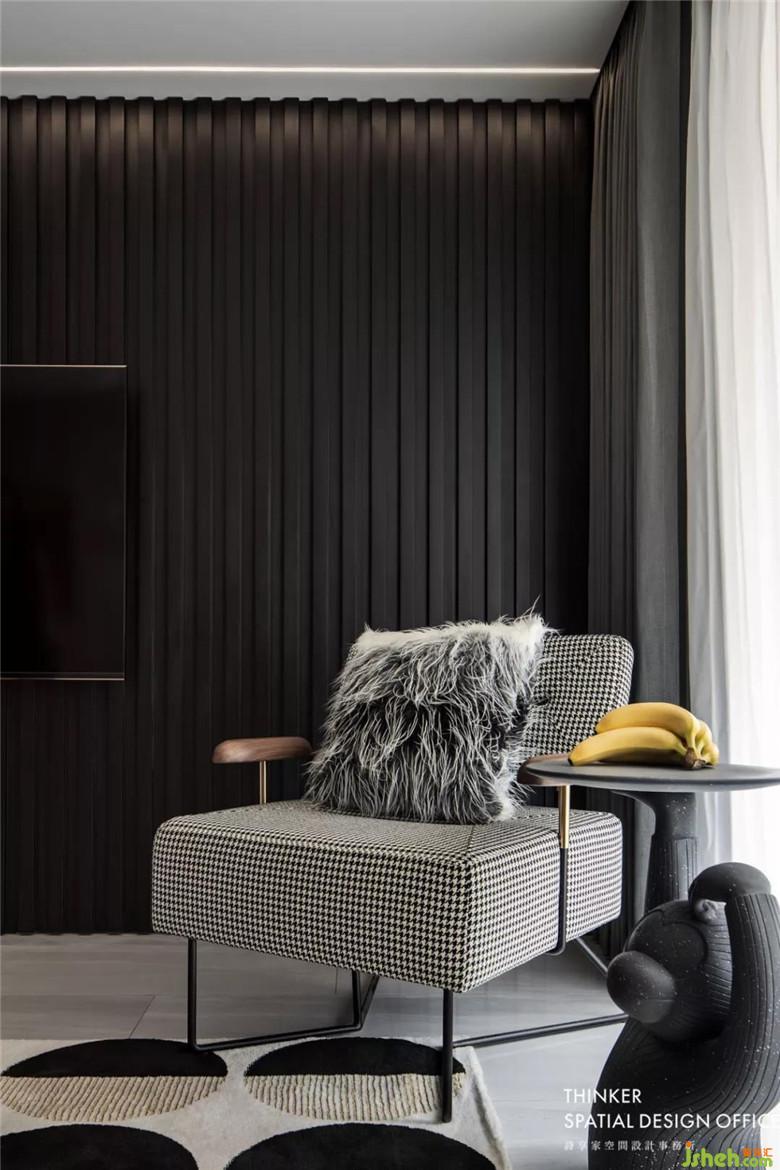 高級(jí)的黑白灰設(shè)計(jì),從來(lái)不在于濃重的沖擊力,而是漫不經(jīng)心的深色誘惑。這面黑色木格柵的電視墻,成為客廳的視覺(jué)焦點(diǎn),純粹的質(zhì)感讓人心動(dòng)。