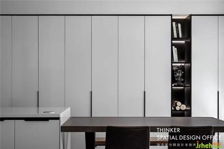 餐桌后方是極簡的收納柜,極簡卻不簡單,雅而不俗,僅以藝術品與幾處精細花瓶點綴,卻足以點亮整個空間。