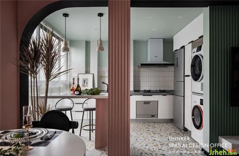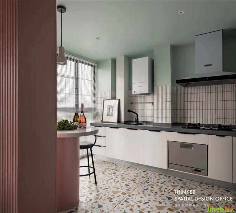 薄荷綠和水磨石,帶來清爽舒適的視覺感受,誰說廚房一定油膩,它也可以成為浪漫的輕食區(qū)!