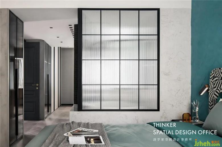 臥室和衛(wèi)生間在劃分區(qū)域的時(shí)候,用黑框玻璃做隔斷,玻璃的通透,加上鐵的金屬質(zhì)感,讓空間顯得更加寬闊,也更加時(shí)尚。