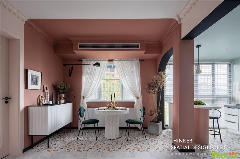· 以大面積色塊進(jìn)行功能區(qū)的分隔,相比物理隔斷更通透開闊;同時色調(diào)不同的粉色系形成視覺上的層次感。