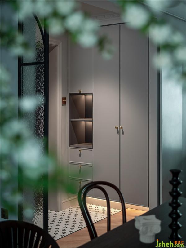 家居設(shè)計(jì)入戶地面做了5cm左右的下沉設(shè)計(jì),鋪貼復(fù)古花磚,方便清掃打理。燈光是感應(yīng)的,一開門自動(dòng)亮起、迎接你回家。