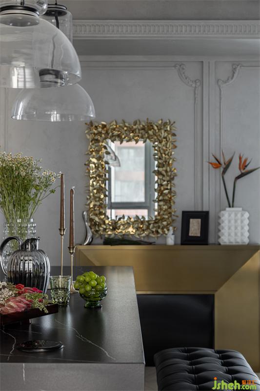 客廳往餐廳望去,金屬制成的壁爐形成空間區(qū)隔。20cm深的壁爐,輕盈不占空間,臺(tái)面上可以擺放香薰、花瓶等小物件。壁爐和鏡子同樣采用金色材質(zhì),更添精致感。