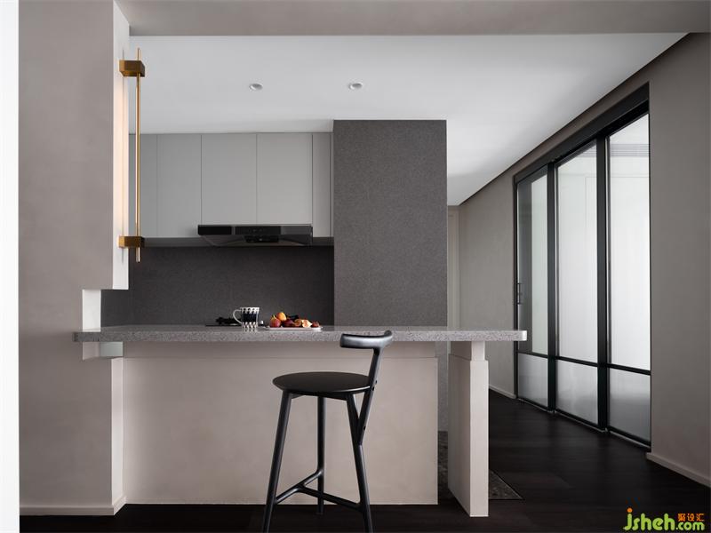 廚房墻面局部拆除,以開放形態(tài)展開。以玄關(guān)為開端設(shè)計(jì)出吧臺(tái),餐后在吧臺(tái)處小酌閑飲,將屋主向往的閑適生活進(jìn)行具象化表達(dá)。