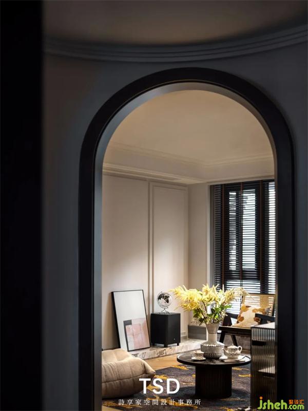 入戶的空間通過拱形門洞延伸開來,踏入此間,視線穿過門洞,觸達多個區(qū)域。由于沒有實在的空間阻隔。視線隨區(qū)域的變化而變化,展現(xiàn)出了不拘一格的自在感。