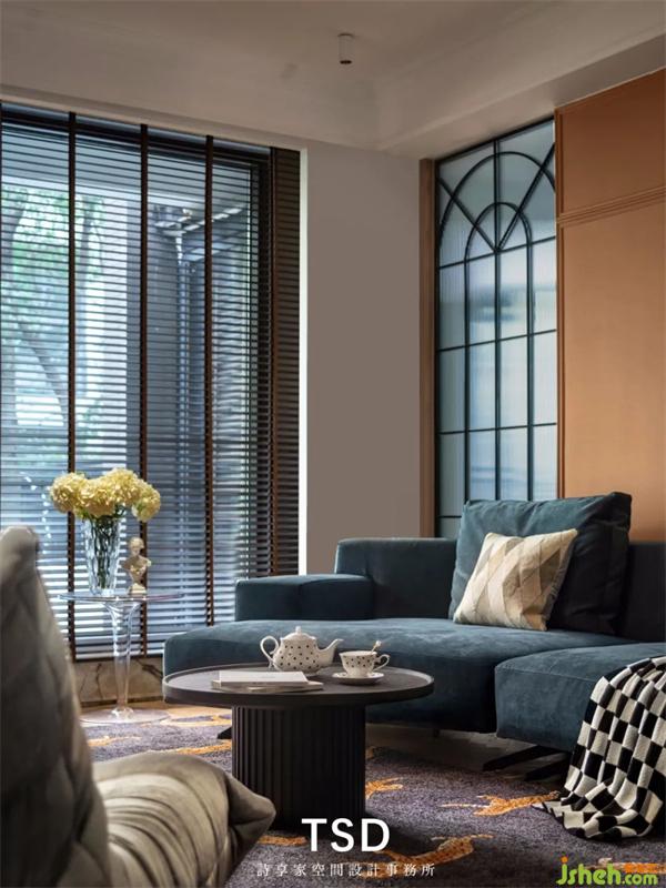 大扇落地窗框住了寧靜自然的窗景,光線自然地透過百葉簾灑在客廳,光影游移,時光由抽象變得具體。
