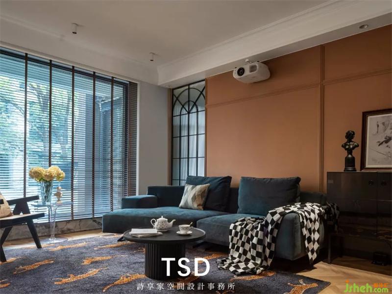 The sofa background improves the texture through decorative lines and colors. The caramel wall is matched with the retro blue sofa, which is retro and elegant.