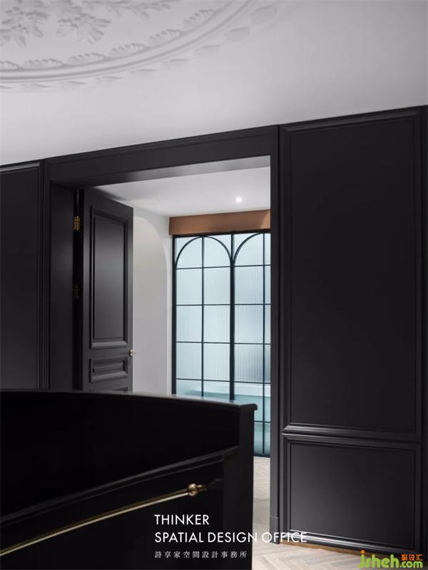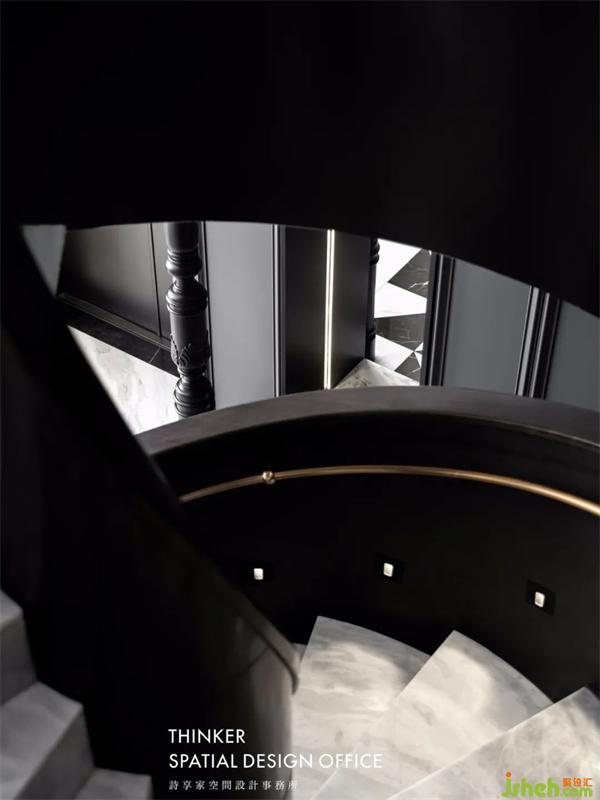 站在門口,透過玄關(guān)境的視線,我們馬上就能感受到設(shè)計(jì)師想要空間呼應(yīng)的想法。拼花地磚呼應(yīng)著旋轉(zhuǎn)樓梯,雕花立柱在現(xiàn)代設(shè)計(jì)中點(diǎn)綴出法式優(yōu)雅,而同時(shí),它們又自成一體地營造出樓梯廳的空間感。設(shè)計(jì),就該是一種系統(tǒng)而整體性的考量。