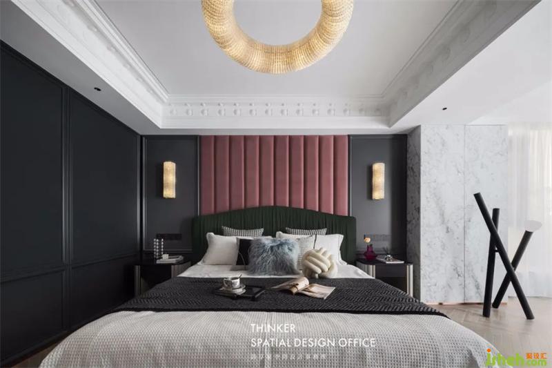 大戶型采光很棒,設(shè)計(jì)師可以大膽地選擇質(zhì)感更好的深色系材質(zhì)。從一樓到二樓,大面積的深灰色護(hù)墻板,給家更好的穩(wěn)定性,天鵝絨軟包與床頭材質(zhì)呼應(yīng),再用水晶燈做明度點(diǎn)綴,設(shè)計(jì)師在這樣的空間中,探尋更豐富的層次感。