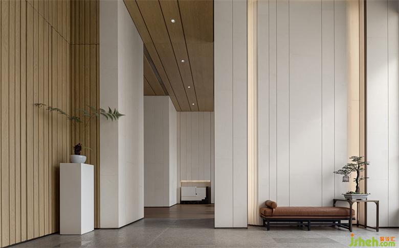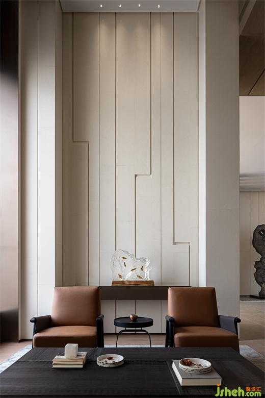 會(huì)客空間設(shè)色明凈,墻立面包裹的白色石材借助山水韻律的抽象線條縱向鋪排,柏悅公館會(huì)所設(shè)計(jì)與深色木紋家具、現(xiàn)代皮革座椅及陳設(shè)的干花、器物共同詮釋著格調(diào)清雅的生活美學(xué)范本。