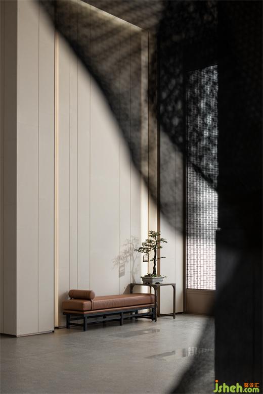 處處鄰虛,方方側(cè)景,旁側(cè)開鑿的一面方形漏窗延續(xù)空間中的幾何線條力量,從廊道另一側(cè)看過(guò)來(lái),柏悅公館會(huì)所設(shè)計(jì)以洞開的窗口構(gòu)圖空間,端臺(tái)上相對(duì)而坐的雕塑藝術(shù)品顧盼之間彼此呼應(yīng),緘默萌趣。