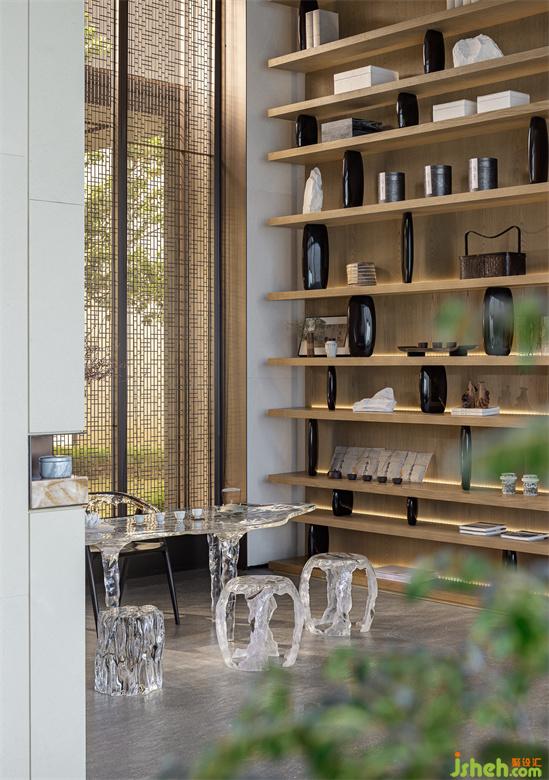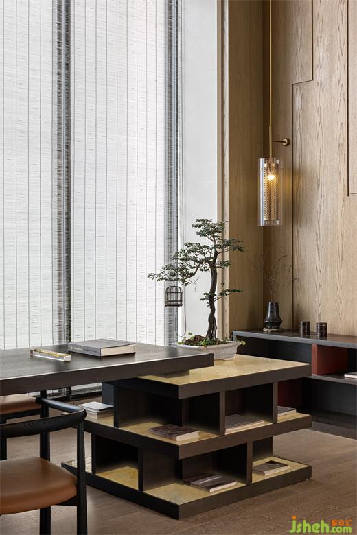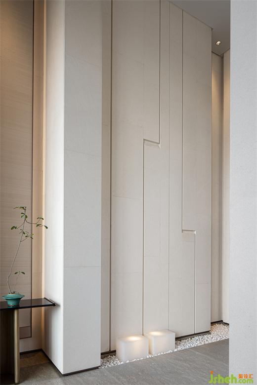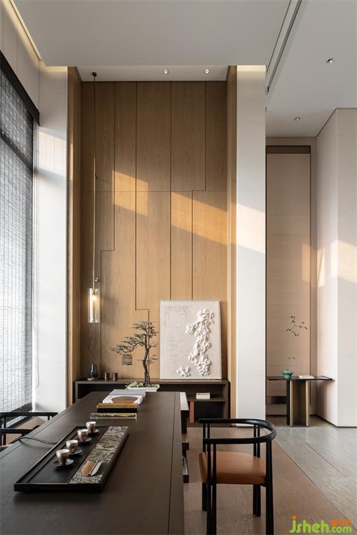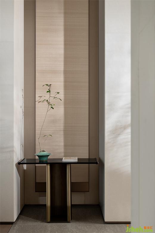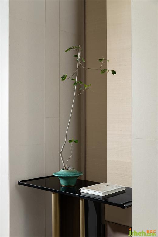 詩意空間設(shè)計嘗試從詩詞及文學(xué)意象中汲取靈感,營造當(dāng)代東方的空間詩性表達,茶室端景一株清靈的水橫枝盆景,柏悅公館會所設(shè)計映襯著橫紋墻布上的隱隱光澤,意境清逸幽淡,點染成一處幽美婉約詞境。